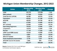 The Michigan Education Association lost nearly one-third of its membership, even though the number of school employees has remained steady since 2012. Despite a nearly 40% increase in construction workers, the state’s largest carpenters’ union still saw a drop in membership.